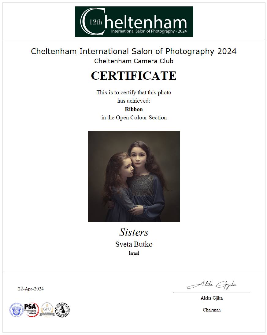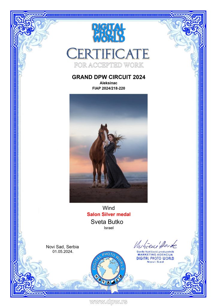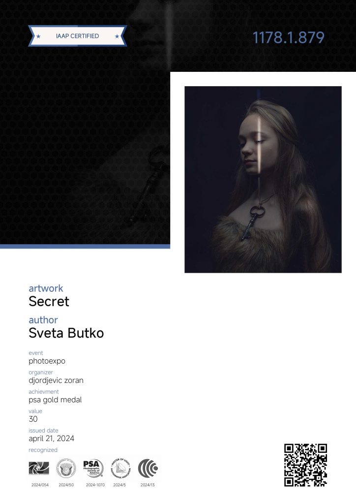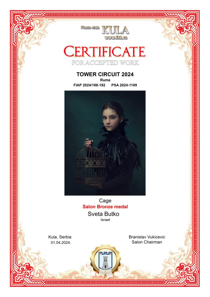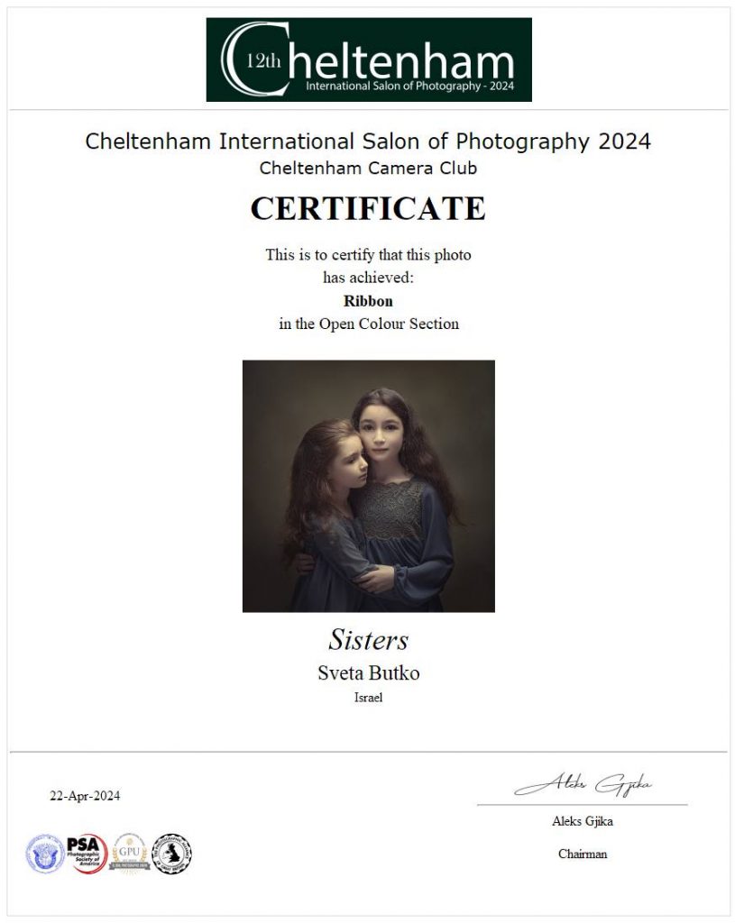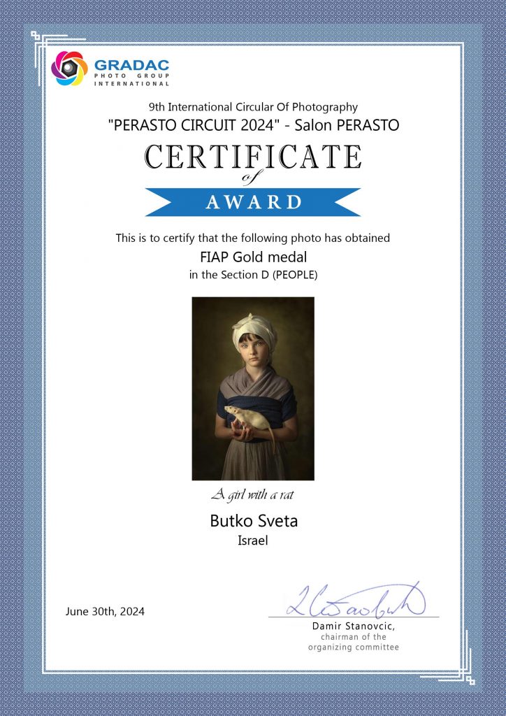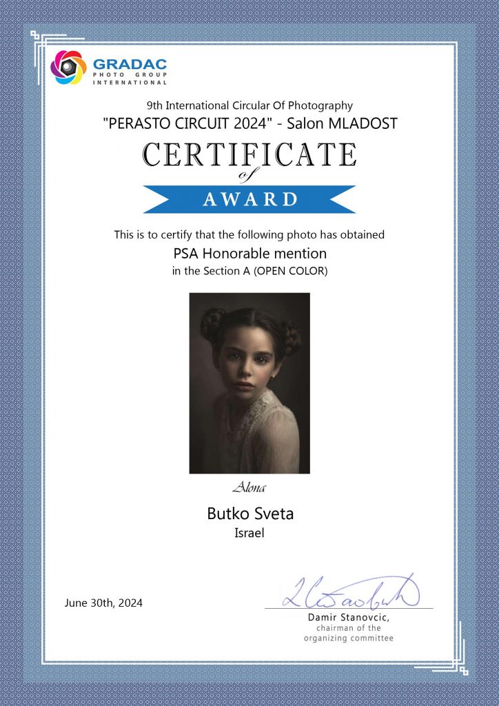 ND AWARDS 2023 INTERNATIONAL PHOTOGRAPHY CONTEST - 1ST PLACE IN PEOPLE: CHILDREN CATEGORY WPE 2024 ANNUAL - CHILDREN - GOLD, SILVER, BRONZE AND 3d PLACE WPE 2024 SECOND HALF - CHILDREN - GOLD AND SILVER ONE EYELAND - WORLD'S TOP 10 PORTRAIT PHOTOGRAPHERS 2024 NEW YORK PHOTOGRAPHY AWARD 2023 - SILVER WINNER 9th ANNUAL INTERNATIONAL IMAGING AWARDS - SLIVER AND BRONZE IN PORTRAIT CATEGORY EXPOSUREONE PHOTOGRAPHER OF THE YEAR 2024 - BRONZE IN PROFESSIONAL PORTRAIT ICON INTERNATIONAL PHOTOGRAPHY AWARD 2023 - SILVER WINNER IN PORTRAIT DIVISION TOKYO INTERNATIONAL FOTO AWARD 2023 - BRONZE WINNER IN PEOPLE, HONORABLE MENTION FINE ART PHOTOGRAPHY AWARDS 10th EDITION - NOMINEE AWARD CHROMATIC PHOTOGRAPHY AWARDS 2023 - HONORABLE MENTION IN PORTRAIT PROFESSIONAL CATEGORY 17TH ANNUAL INTERNATIONAL COLOR AWARDS - HONORABLE MENTION 18TH ANNUAL BLACK & WHITE SPIDER AWARDS - HONORABLE MENTION IN CHILDREN OF THE WORLD CATEGORY 35AWARD 2019 - TOP 10 GREAT CHILDREN PHOTO PHOTOGRAPHER 35AWARD 2018 - BEST PHOTOGRAPHER 35AWARD 2017 - 1st PLACE INTERNATIONAL PHOTOGRAPHY SALONS WITH PSA (PHOTOGRAPHIC SOCIETY OF AMERICA) AND FIAP (INTERNATIONAL FEDERATION OF PHOTOGRAPHIC ART) RECOGNITION PSA Gold Medal PSA Honorable Mention Salon Honorable Mention FIAP Gol Medal Salon Gold Medal FIAP Gold medal PSA Gold medal E-Jury certificate E-Jury certificate Chairman choice gold PSA Gold Medal Salon Gold Medal Salon Gold medal Jury choice E-HM E-HM E-HM PSA Gold Medal FIAP Gold Medal PSA Gold Medal Salon Silver Medal Salon Bronze Medal Salon Honorable Mention SSS Club gold medal Best photo of the theme Silver Medal Honorable mention Certificate of merit Salon Diploma Salon ribbon Ribbon Salon diploma Salon Silver Medal FIAP Honorable Mention Salon Silver Medal Salon Honorable Mention Salon Honorable Mention Salon Honorable Mention Salon Honorable Mention OTHER CERTIFICATES 1st PLACE Silver Winner Bronze winner TOP10 Great children photo photographer 1st PLACE TOP10 Portrait with natural light photographer International Association of Art Photographers Distinction