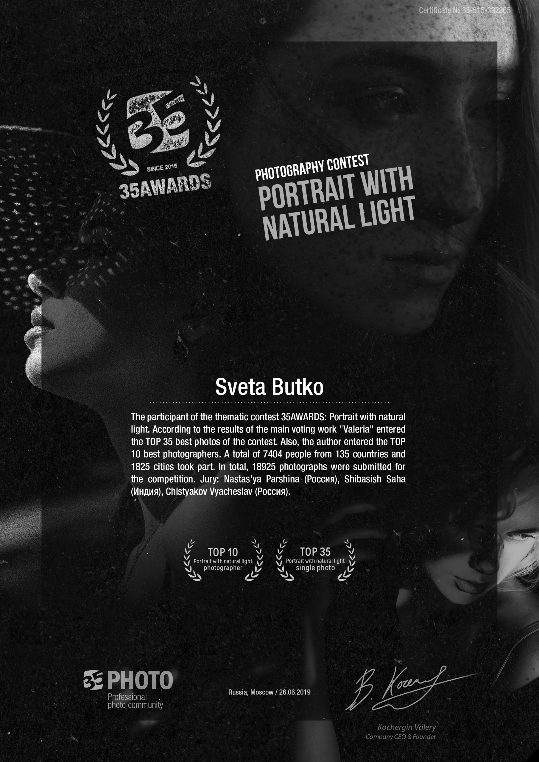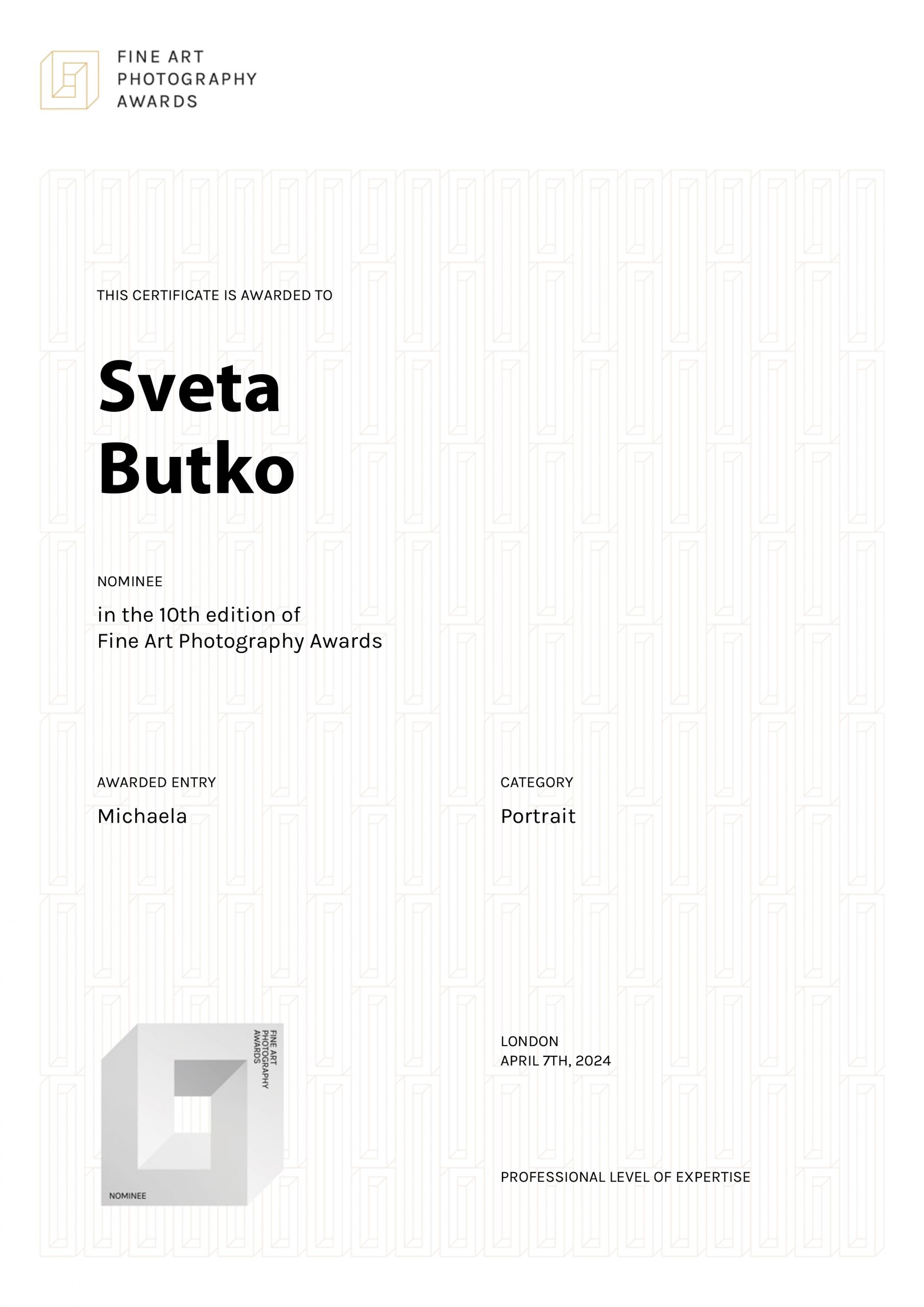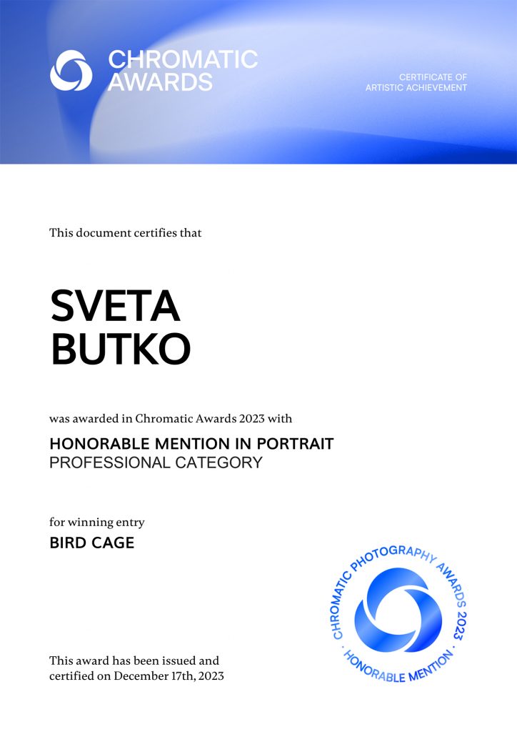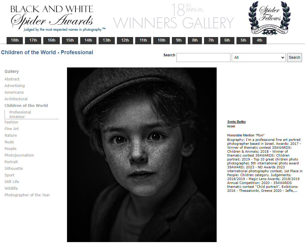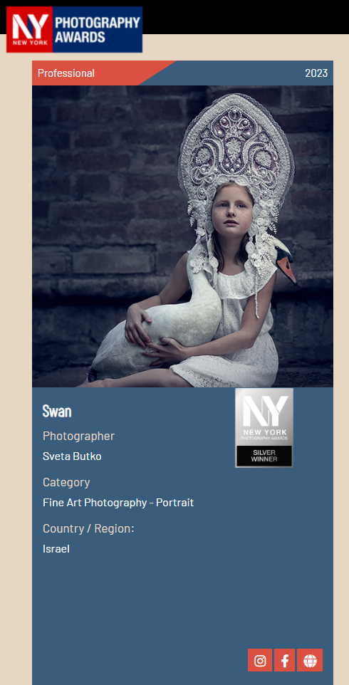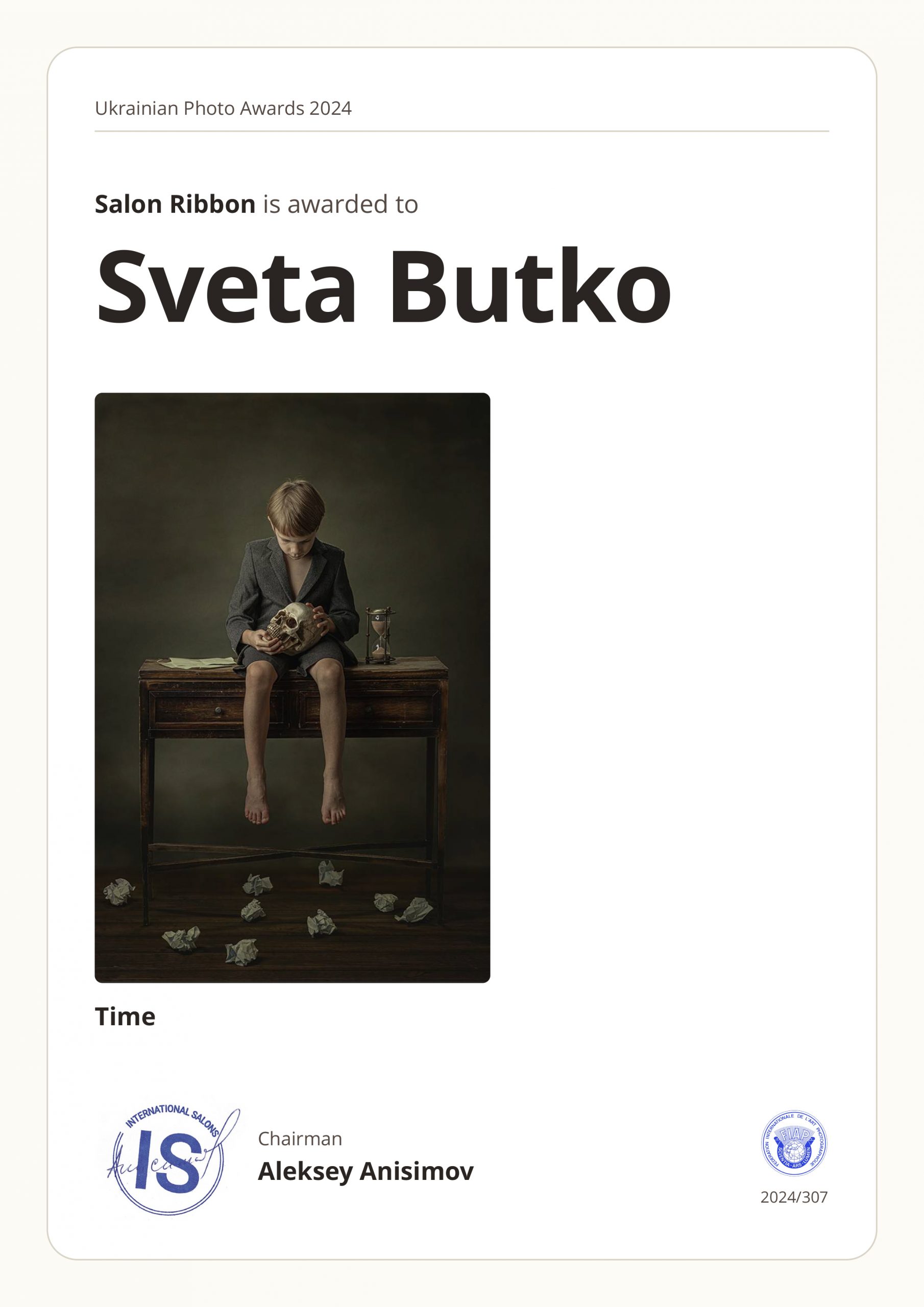ND AWARDS 2023 INTERNATIONAL PHOTOGRAPHY CONTEST - 1ST PLACE IN PEOPLE: CHILDREN CATEGORY WPE 2024 ANNUAL - CHILDREN - GOLD, SILVER, BRONZE AND 3d PLACE WPE 2024 SECOND HALF - CHILDREN - GOLD AND SILVER ONE EYELAND - WORLD'S TOP 10 PORTRAIT PHOTOGRAPHERS 2024 NEW YORK PHOTOGRAPHY AWARD 2023 - SILVER WINNER 9th ANNUAL INTERNATIONAL IMAGING AWARDS - SLIVER AND BRONZE IN PORTRAIT CATEGORY EXPOSUREONE PHOTOGRAPHER OF THE YEAR 2024 - BRONZE IN PROFESSIONAL PORTRAIT ICON INTERNATIONAL PHOTOGRAPHY AWARD 2023 - SILVER WINNER IN PORTRAIT DIVISION TOKYO INTERNATIONAL FOTO AWARD 2023 - BRONZE WINNER IN PEOPLE, HONORABLE MENTION FINE ART PHOTOGRAPHY AWARDS 10th EDITION - NOMINEE AWARD CHROMATIC PHOTOGRAPHY AWARDS 2023 - HONORABLE MENTION IN PORTRAIT PROFESSIONAL CATEGORY 17TH ANNUAL INTERNATIONAL COLOR AWARDS - HONORABLE MENTION 18TH ANNUAL BLACK & WHITE SPIDER AWARDS - HONORABLE MENTION IN CHILDREN OF THE WORLD CATEGORY 35AWARD 2019 - TOP 10 GREAT CHILDREN PHOTO PHOTOGRAPHER 35AWARD 2018 - BEST PHOTOGRAPHER 35AWARD 2017 - 1st PLACE INTERNATIONAL PHOTOGRAPHY SALONS WITH PSA (PHOTOGRAPHIC SOCIETY OF AMERICA) AND FIAP (INTERNATIONAL FEDERATION OF PHOTOGRAPHIC ART) RECOGNITION PSA Gold Medal PSA Honorable Mention Salon Honorable Mention FIAP Gol Medal Salon Gold Medal FIAP Gold medal PSA Gold medal E-Jury certificate E-Jury certificate Chairman choice gold PSA Gold Medal Salon Gold Medal Salon Gold medal Jury choice E-HM E-HM E-HM PSA Gold Medal FIAP Gold Medal PSA Gold Medal Salon Silver Medal Salon Bronze Medal Salon Honorable Mention SSS Club gold medal Best photo of the theme Silver Medal Honorable mention Certificate of merit Salon Diploma Salon ribbon Ribbon Salon diploma Salon Silver Medal FIAP Honorable Mention Salon Silver Medal Salon Honorable Mention Salon Honorable Mention Salon Honorable Mention Salon Honorable Mention OTHER CERTIFICATES 1st PLACE Silver Winner Bronze winner TOP10 Great children photo photographer 1st PLACE TOP10 Portrait with natural light photographer International Association of Art Photographers Distinction