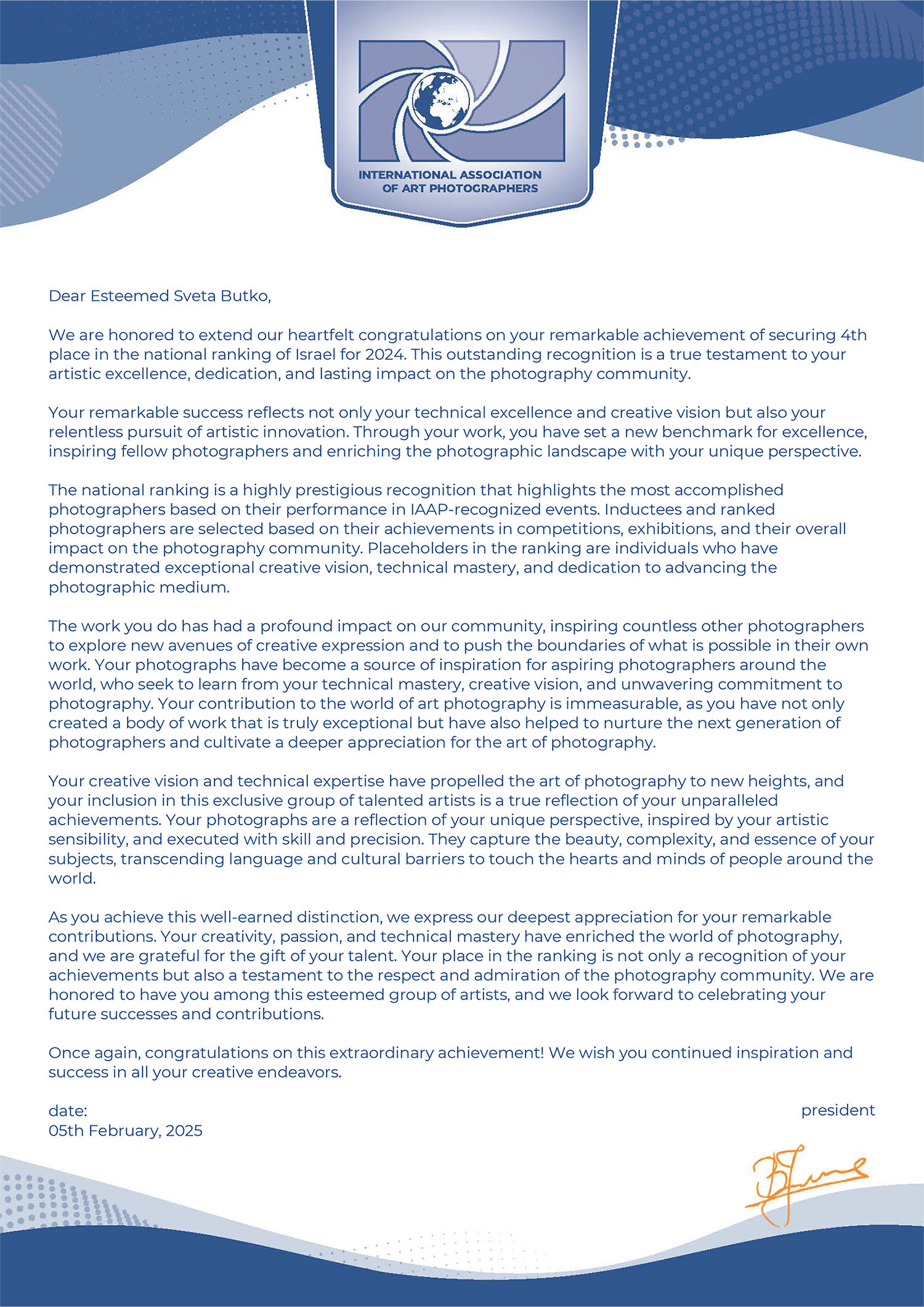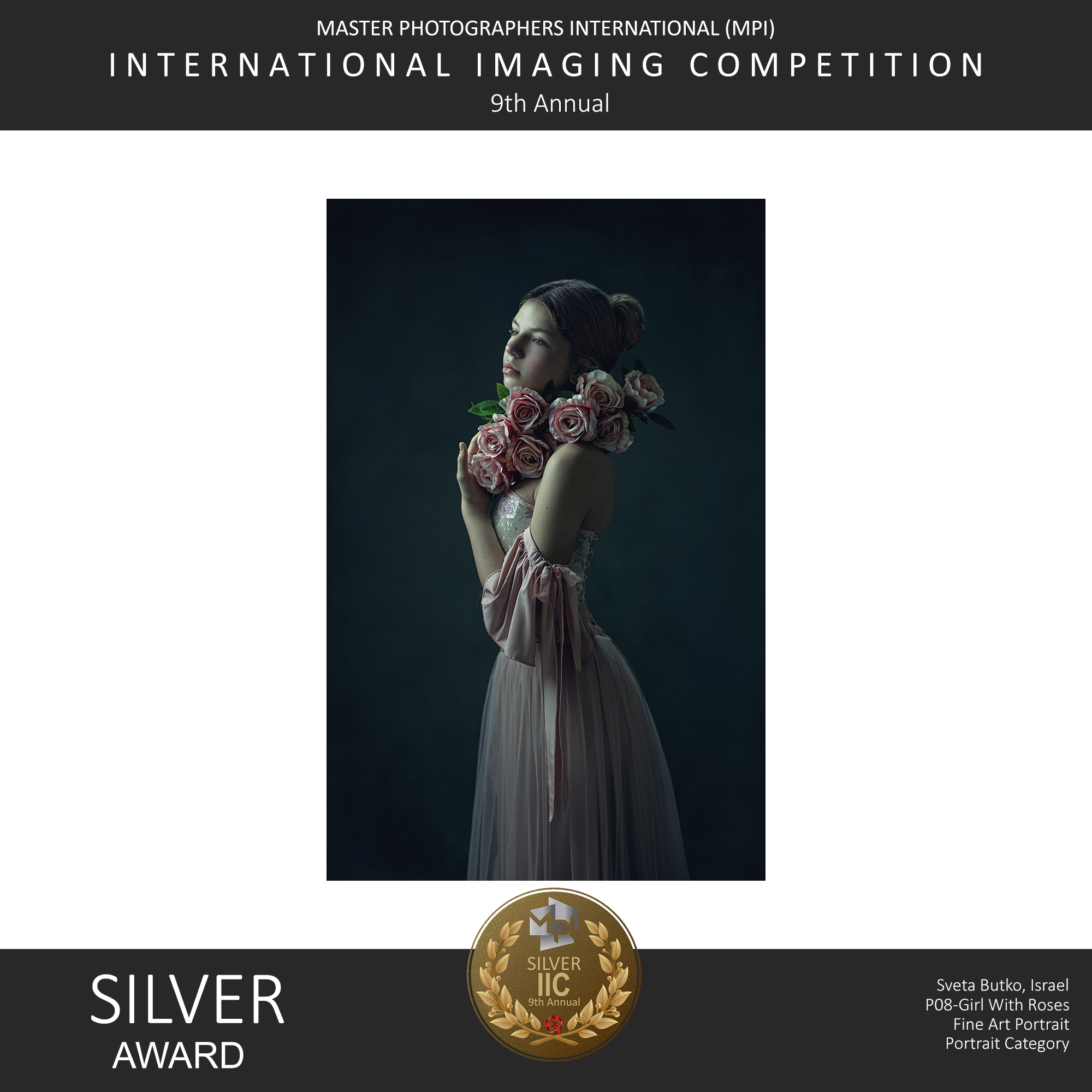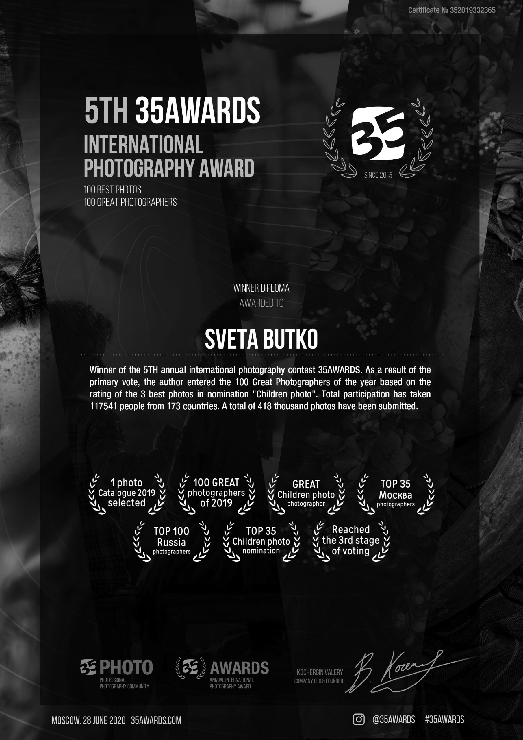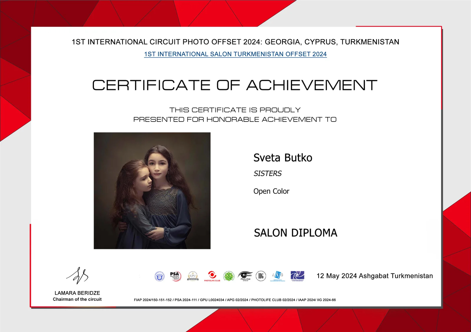 ND AWARDS 2023 INTERNATIONAL PHOTOGRAPHY CONTEST - 1ST PLACE IN PEOPLE: CHILDREN CATEGORY WPE 2024 ANNUAL - CHILDREN - GOLD, SILVER, BRONZE AND 3d PLACE WPE 2024 SECOND HALF - CHILDREN - GOLD AND SILVER ONE EYELAND - WORLD'S TOP 10 PORTRAIT PHOTOGRAPHERS 2024 NEW YORK PHOTOGRAPHY AWARD 2023 - SILVER WINNER 9th ANNUAL INTERNATIONAL IMAGING AWARDS - SLIVER AND BRONZE IN PORTRAIT CATEGORY EXPOSUREONE PHOTOGRAPHER OF THE YEAR 2024 - BRONZE IN PROFESSIONAL PORTRAIT ICON INTERNATIONAL PHOTOGRAPHY AWARD 2023 - SILVER WINNER IN PORTRAIT DIVISION TOKYO INTERNATIONAL FOTO AWARD 2023 - BRONZE WINNER IN PEOPLE, HONORABLE MENTION FINE ART PHOTOGRAPHY AWARDS 10th EDITION - NOMINEE AWARD CHROMATIC PHOTOGRAPHY AWARDS 2023 - HONORABLE MENTION IN PORTRAIT PROFESSIONAL CATEGORY 17TH ANNUAL INTERNATIONAL COLOR AWARDS - HONORABLE MENTION 18TH ANNUAL BLACK & WHITE SPIDER AWARDS - HONORABLE MENTION IN CHILDREN OF THE WORLD CATEGORY 35AWARD 2019 - TOP 10 GREAT CHILDREN PHOTO PHOTOGRAPHER 35AWARD 2018 - BEST PHOTOGRAPHER 35AWARD 2017 - 1st PLACE INTERNATIONAL PHOTOGRAPHY SALONS WITH PSA (PHOTOGRAPHIC SOCIETY OF AMERICA) AND FIAP (INTERNATIONAL FEDERATION OF PHOTOGRAPHIC ART) RECOGNITION PSA Gold Medal PSA Honorable Mention Salon Honorable Mention FIAP Gol Medal Salon Gold Medal FIAP Gold medal PSA Gold medal E-Jury certificate E-Jury certificate Chairman choice gold PSA Gold Medal Salon Gold Medal Salon Gold medal Jury choice E-HM E-HM E-HM PSA Gold Medal FIAP Gold Medal PSA Gold Medal Salon Silver Medal Salon Bronze Medal Salon Honorable Mention SSS Club gold medal Best photo of the theme Silver Medal Honorable mention Certificate of merit Salon Diploma Salon ribbon Ribbon Salon diploma Salon Silver Medal FIAP Honorable Mention Salon Silver Medal Salon Honorable Mention Salon Honorable Mention Salon Honorable Mention Salon Honorable Mention OTHER CERTIFICATES 1st PLACE Silver Winner Bronze winner TOP10 Great children photo photographer 1st PLACE TOP10 Portrait with natural light photographer International Association of Art Photographers Distinction